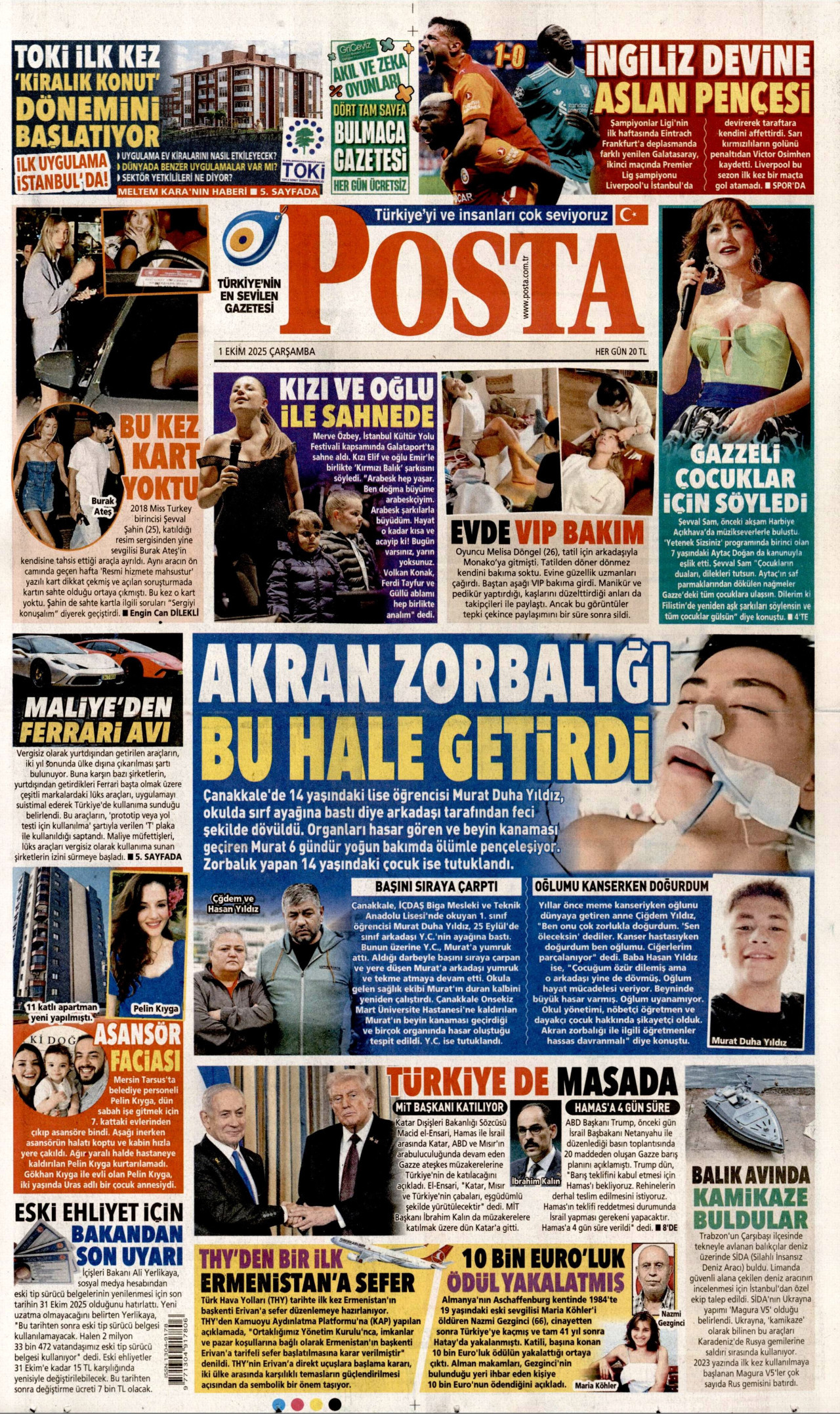 POSTA Gazetesi 01 Ekim 2025, Çarşamba Günü Manşeti